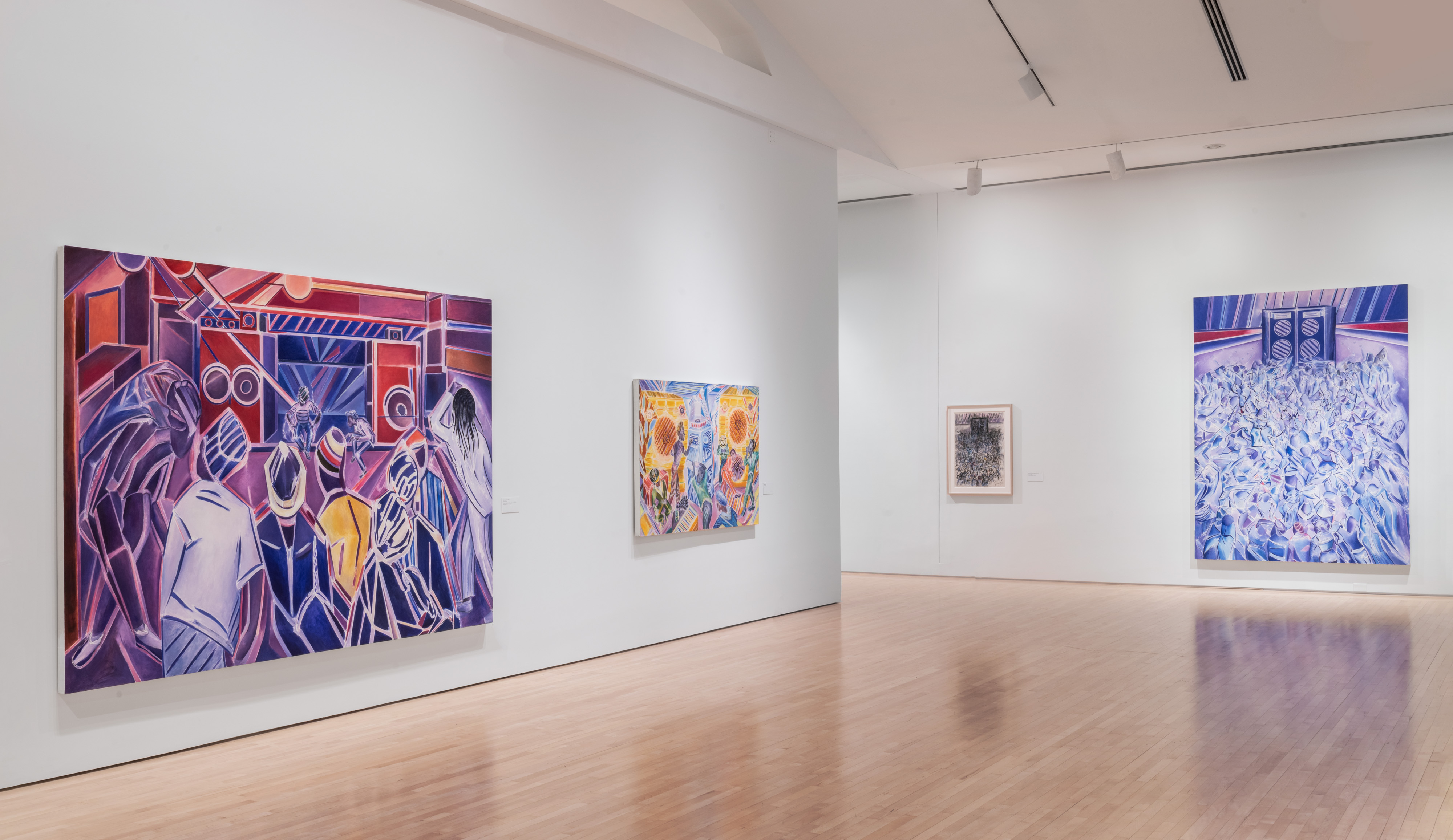 This exhibition presents thirty years of expressive paintings and drawings by Cornwall, UK–based artist Denzil Forrester MBE (Grenadian-British, born 1956). Taking inspiration from London’s dub reggae culture and clubs of the 1980s, Forrester’s working process is analogous to creating versions or reconfigurations of the same music track. Forrester’s numerous sketches from this period, made in the semi-darkness of urban dancehalls, continue to inform his paintings today. References to the diaspora, dub reggae, and the policing of Black cultural expression in Britain reverberate like a refrain throughout his practice. These figures and expressions read like a visual dub mix, echoing one another, and reconstituting themselves while projecting the transformative energy of the music.