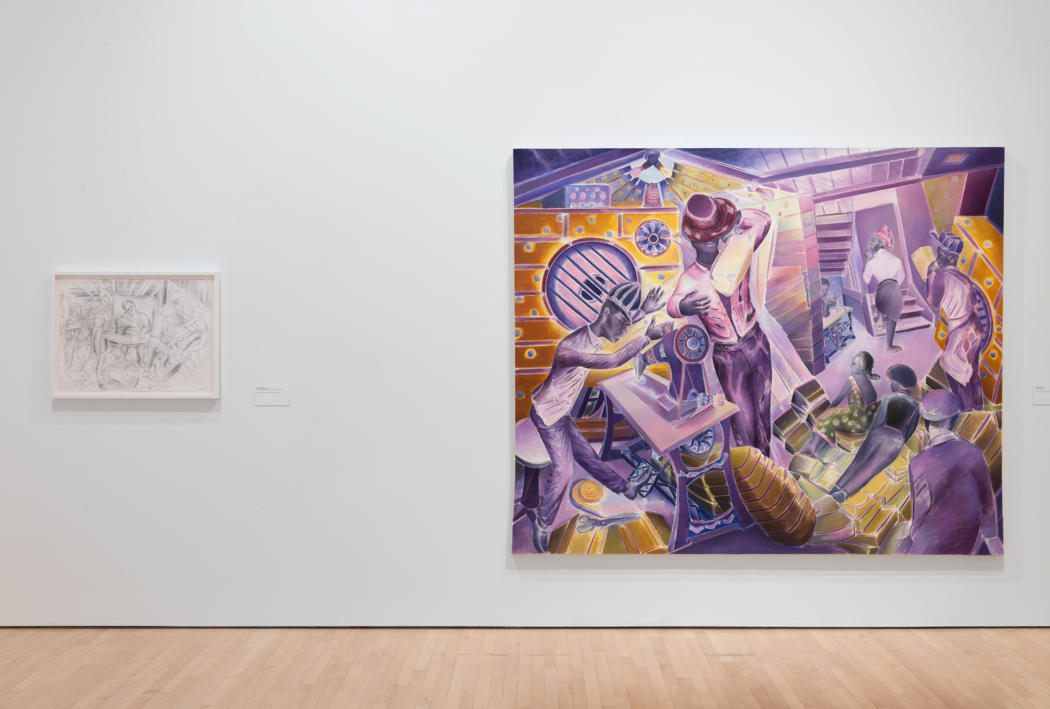 Originating in Jamaica at about the time Forrester moved to East London in 1967, dub reggae speaks to his memories of the Caribbean while representing a vibrant cultural community in the UK. Works such as Rave On (1991), capture the energy of the dancing crowds and the idiosyncratic styles the clubbers wore. While such images express a sense of joy and freedom, paintings such as Brixton Blue (2018), also hint at the oppression of Black cultural life in Britain. Inspired by the death in police custody of the artist’s friend Winston Rose, this work exposes the physical, social, and emotional brutality inflicted on the Black body.