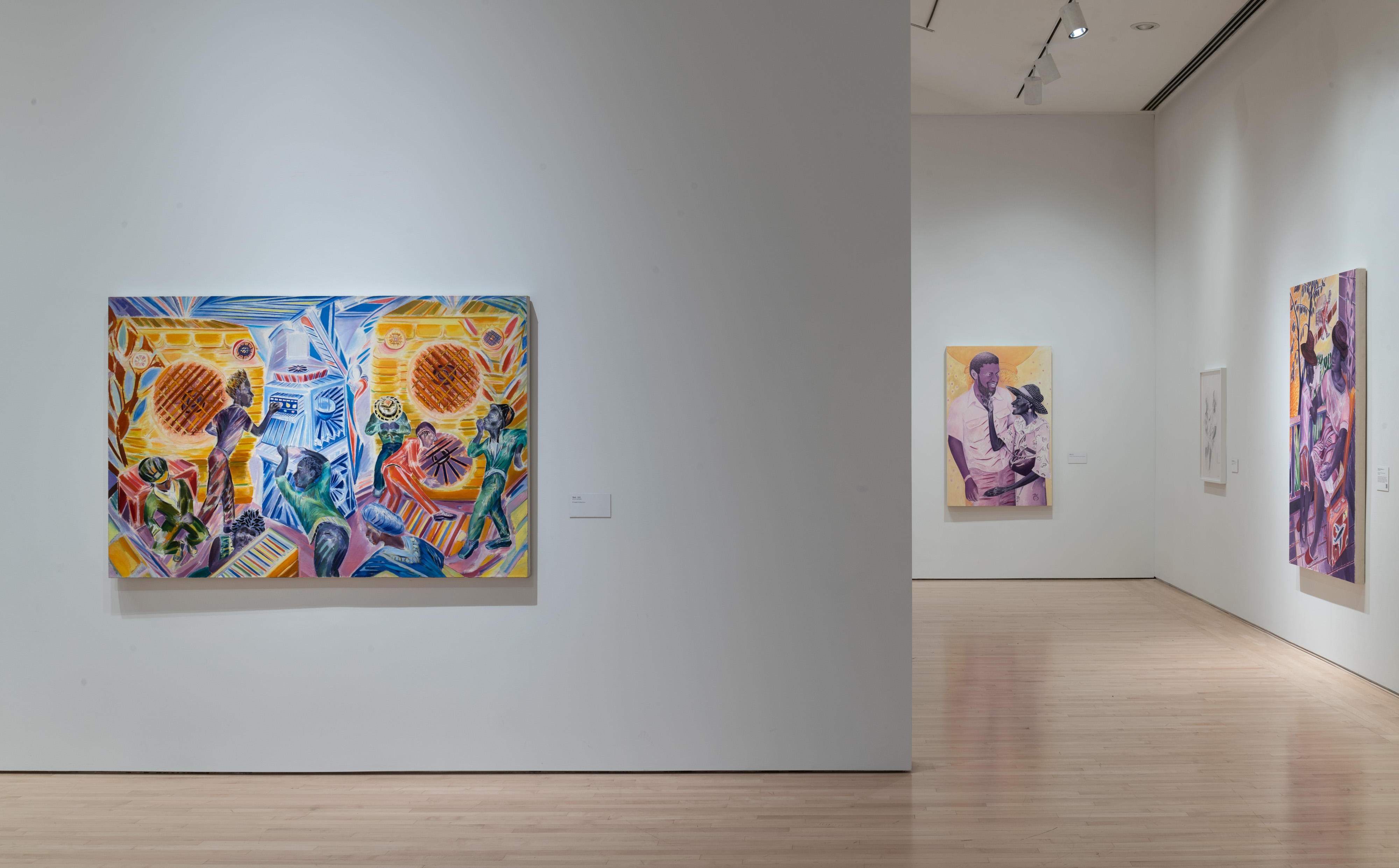 Duppy, an African word that evokes spirits and ancestors, is related semantically to dub, or the altered recordings of familiar songs made anew. This idea mirrors the dynamic of music that echoes the past, speaks in the present, and anticipates the future. Key paintings in the exhibition Stitch Up (2017) and Reading with Ma Pets (2018), reveal the convergence of timelines that similarly defines Forrester’s work, from his childhood memories of Grenada to his experiences of London as a young man.