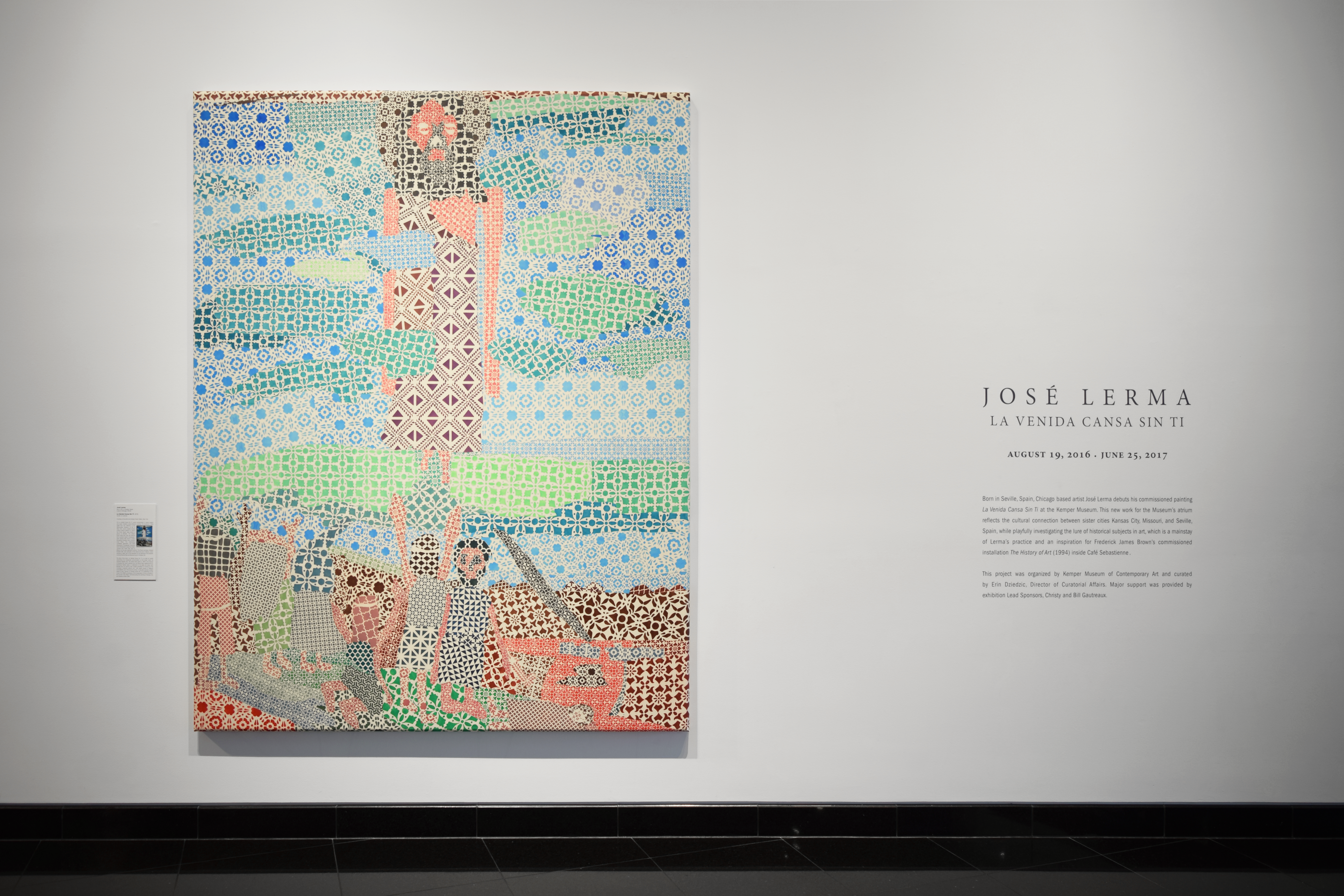 José Lerma, Spanish-born, Chicago-based artist, presented a commissioned site-responsive project for a prominent location in the Kemper Museum Atrium. Upon visiting the Kemper Museum and Kansas City, the artist found inspiration within the art upon the walls of the Museum and the architecture within the surrounding community. Frederick James Brown’s commissioned project for the Kemper Museum’s Café Sebastienne, particularly the patterns and repeated motifs that appear within the massive grid of paintings, inspired Lerma to make his own historical representation of Brown’s The Ascension (1982) in the collection of the Metropolitan Museum of Art in New York. The painting will be created using custom stencils that imitate the Andalusian style of tiles found on the stairs throughout the Country Club Plaza. Lerma’s commission opened on the cusp of the 50th anniversary of the twinning of Kansas City and Seville as sister cities.