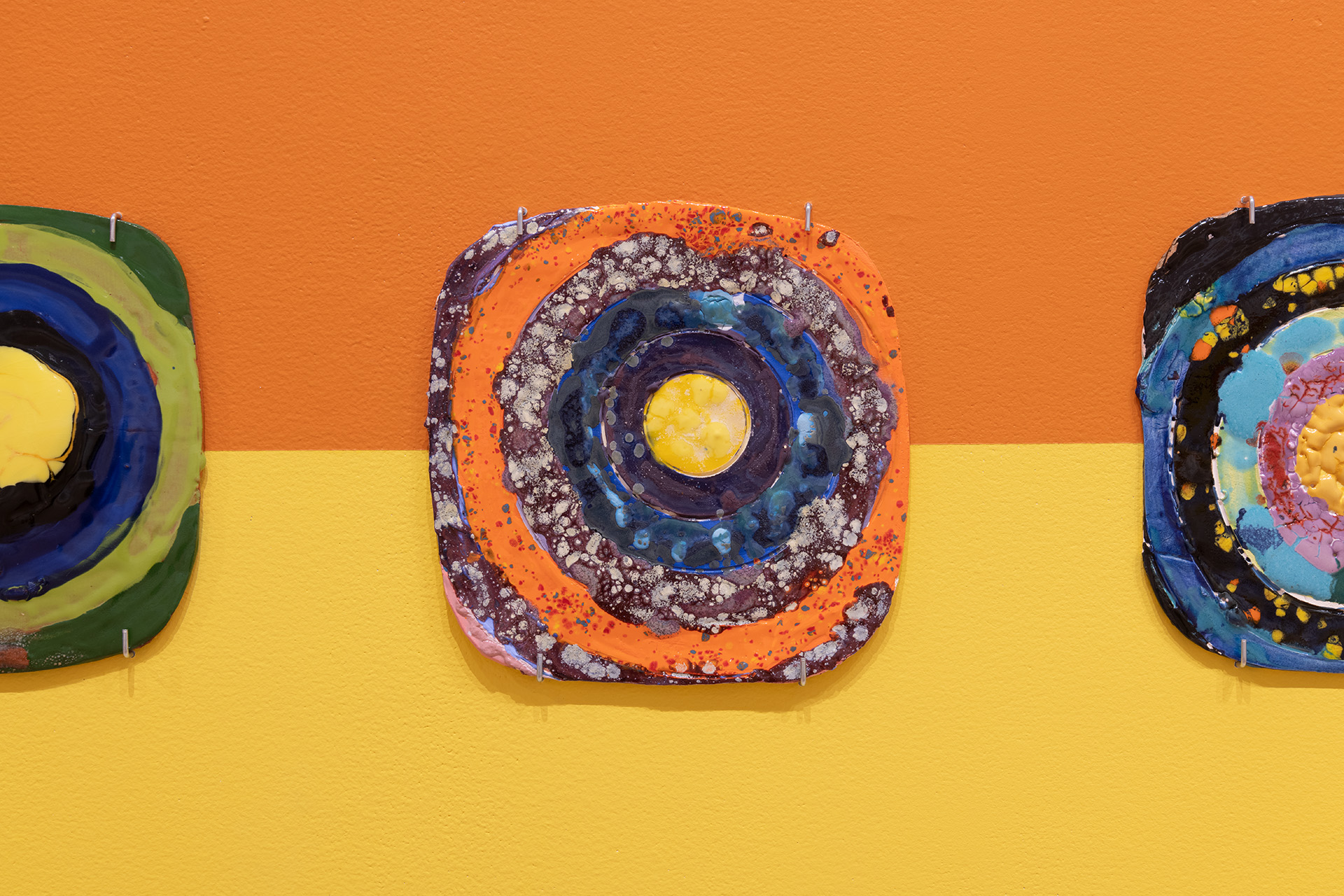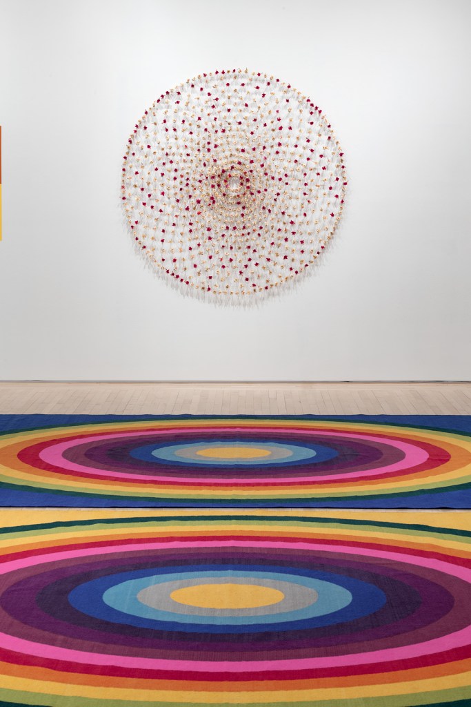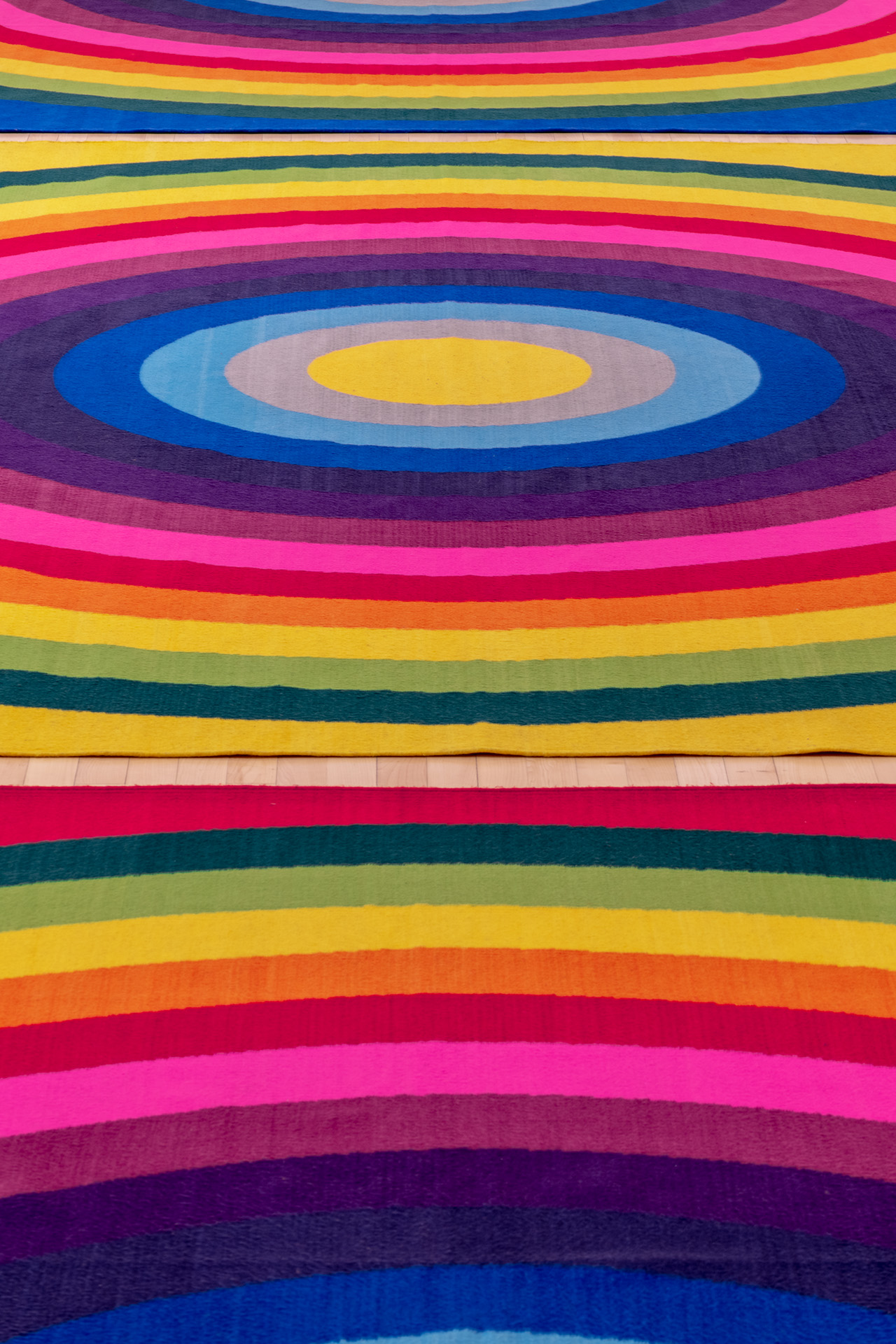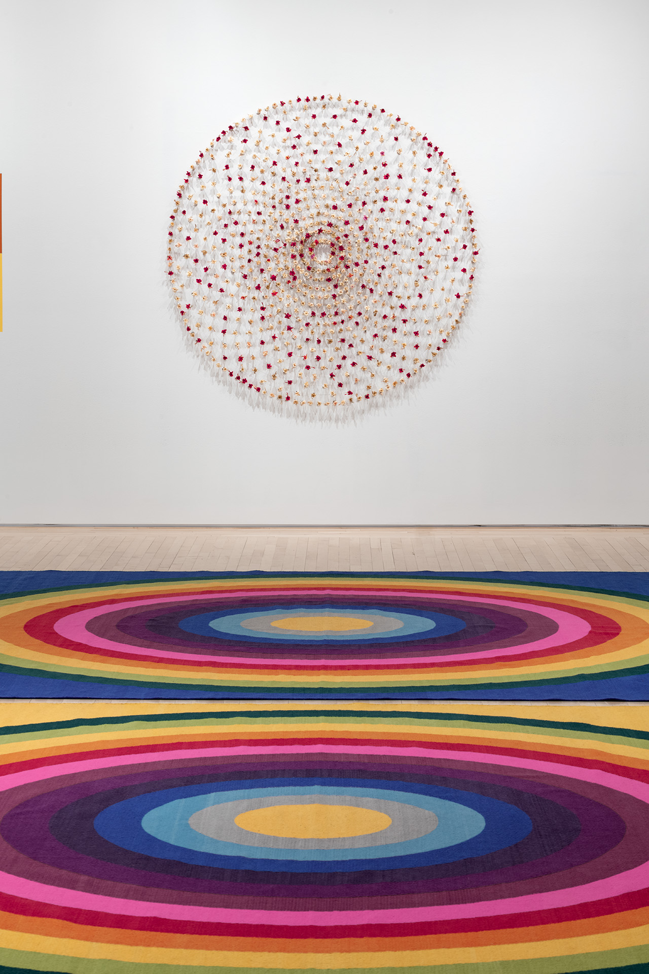 Apfelbaum’s artistic practice is distinguished by a hybridized aesthetic that fuses traditions of painting, craft, and installation. Deploying a wide variety of media—including fabric, paint, dyes, wallpaper, and ceramics—her work has dissolved spatial, plastic, and temporal boundaries. She is best known for expansive polychromatic installations, which coalesce the radical and the beautiful with the domestic and irreverent. This fusion of cultural references is present in the title of the exhibition which comes from the 1970s song lyrics “Waiting for the UFOs” by British band Graham Parker & The Rumour. It is coupled with surrealist artist René Magritte’s definition of a garden as “a space between a landscape and a bunch of flowers,” and refers to his extraordinary landscape painting The Plagiarism (1940).