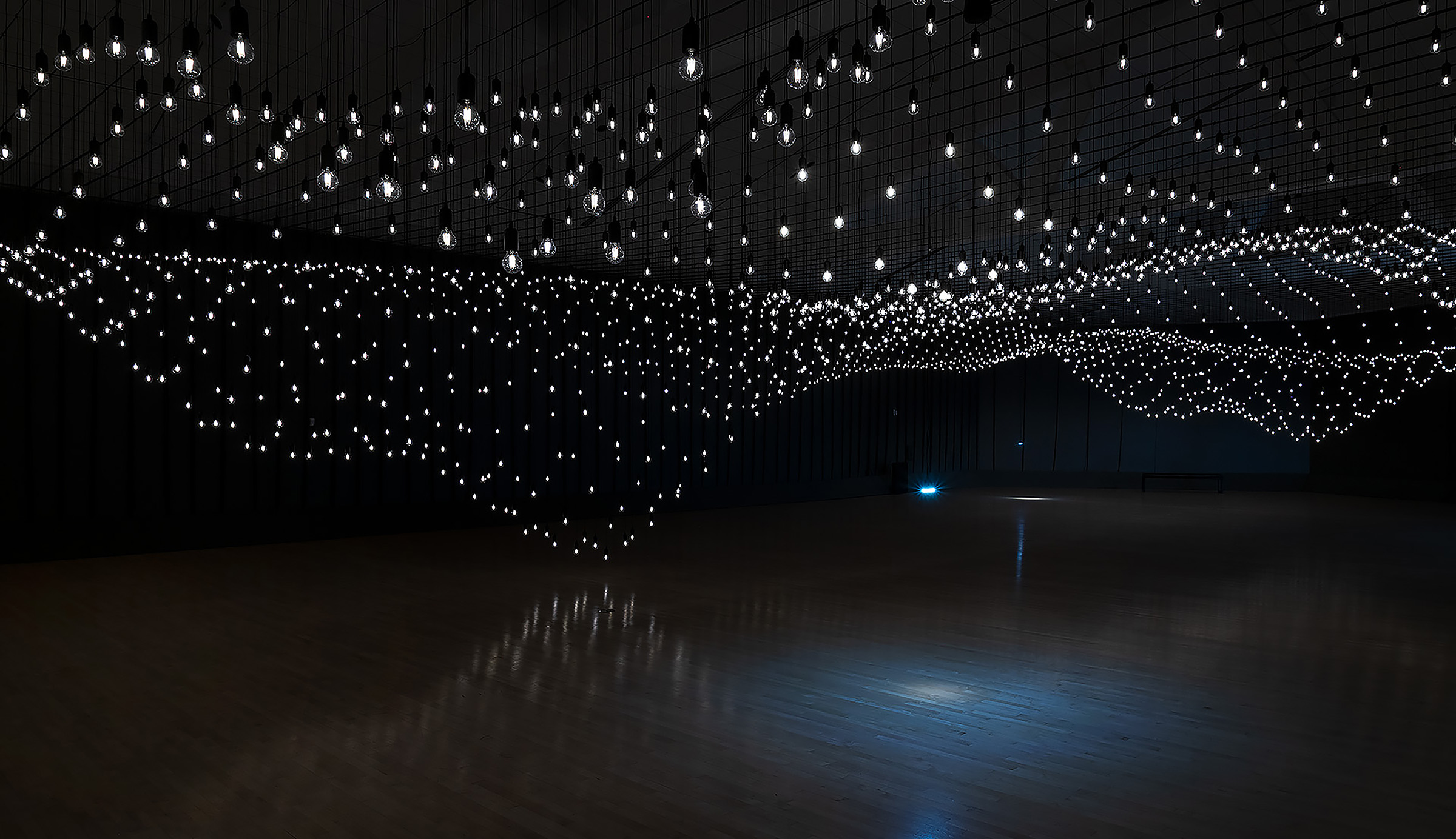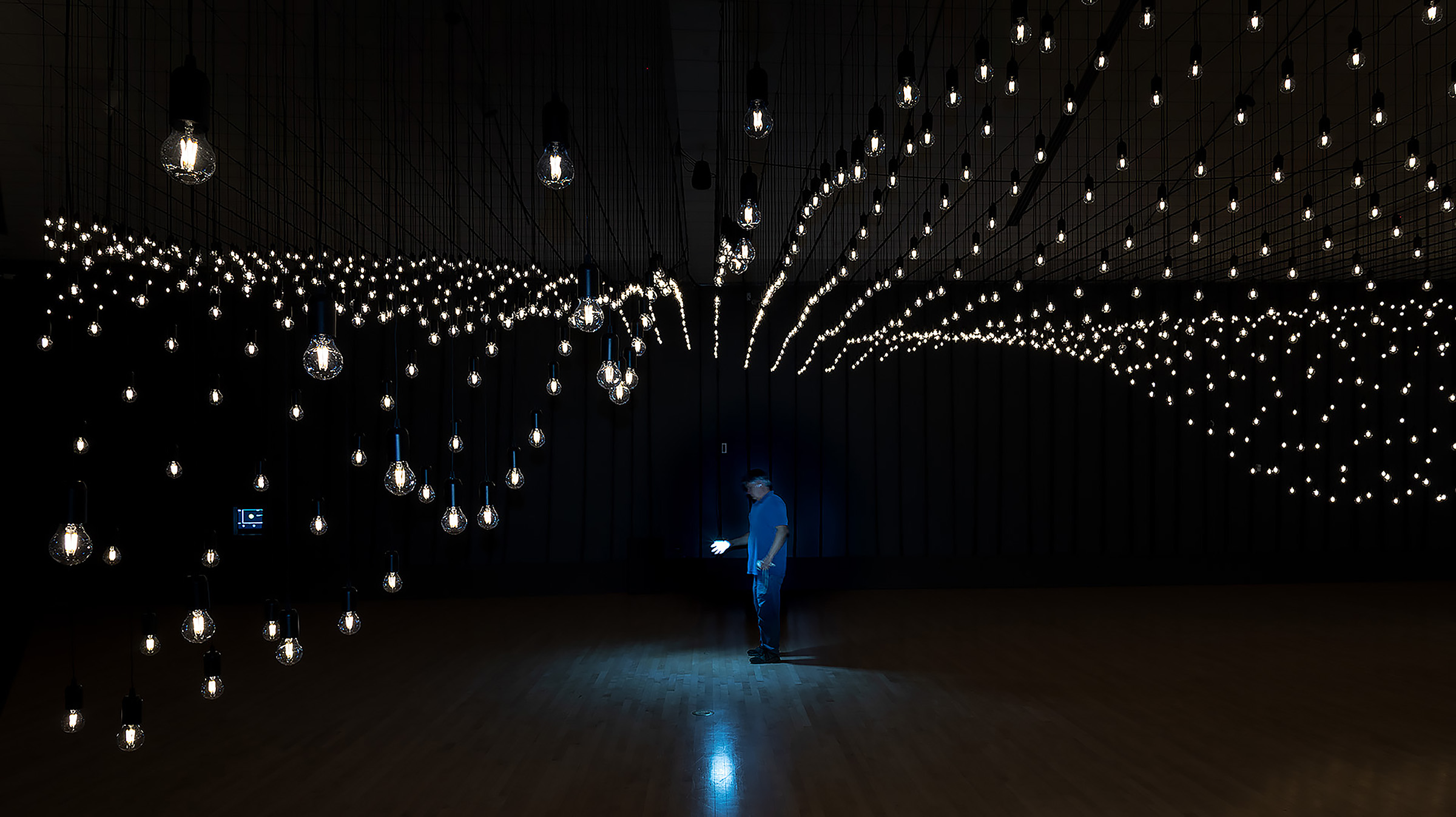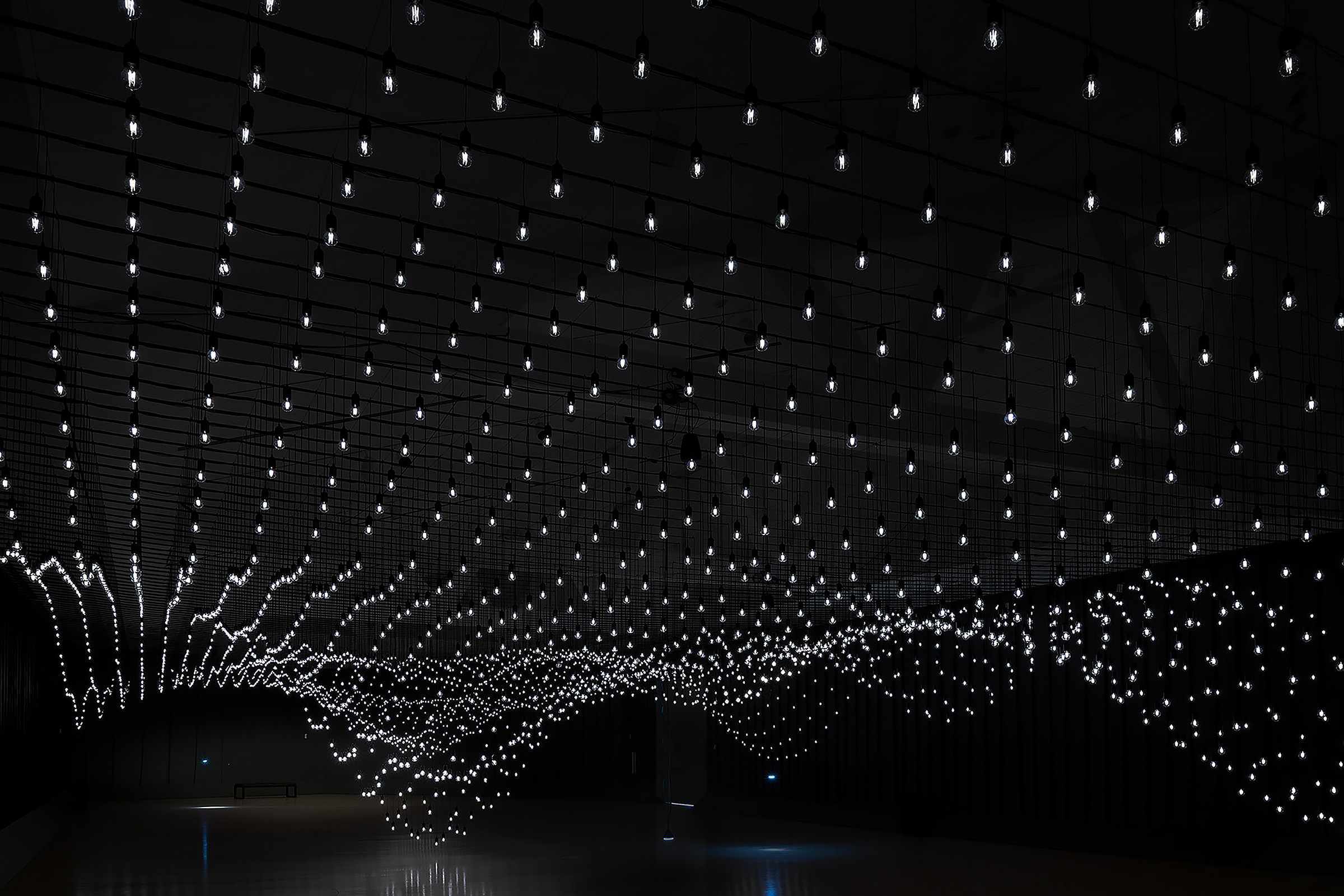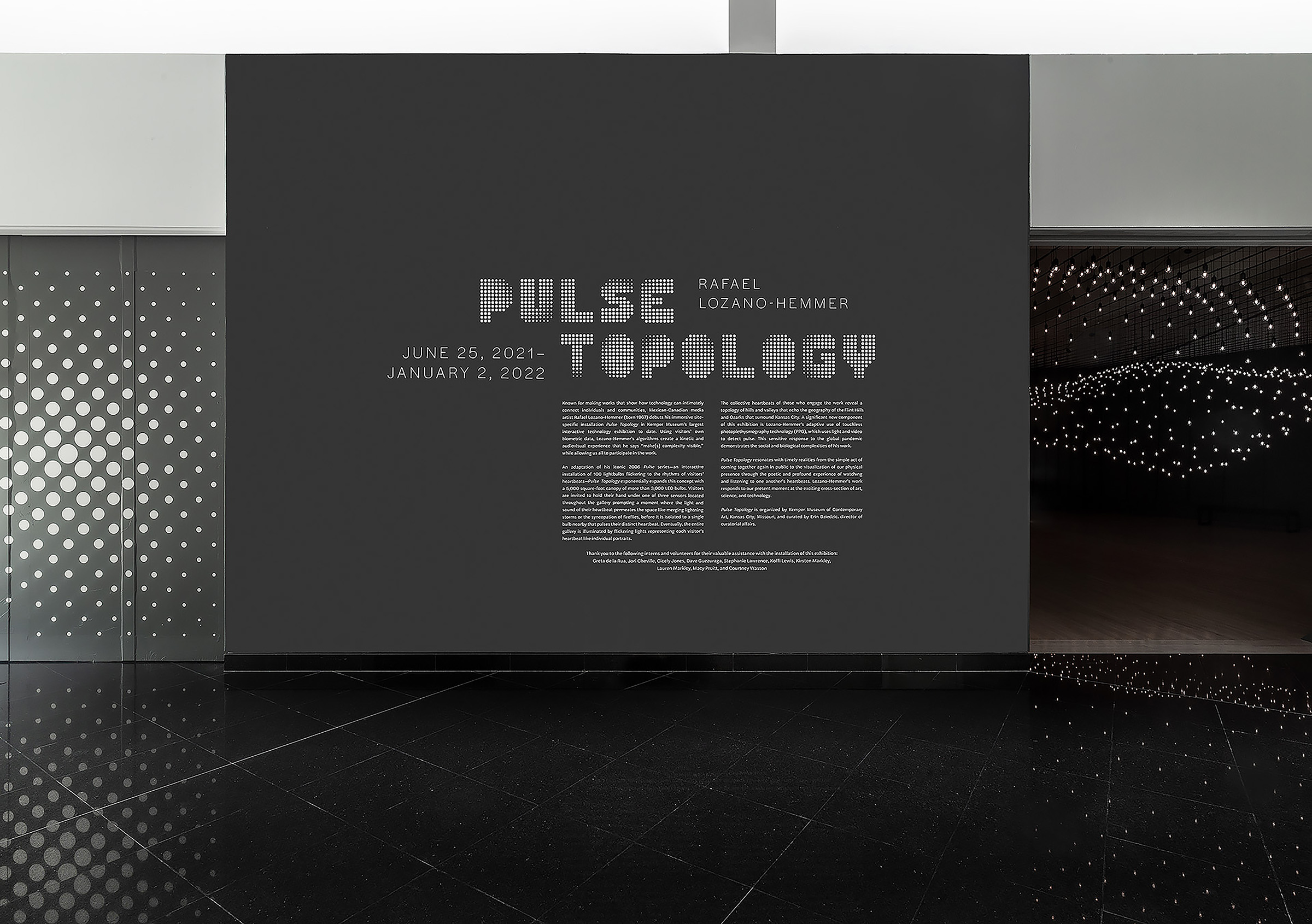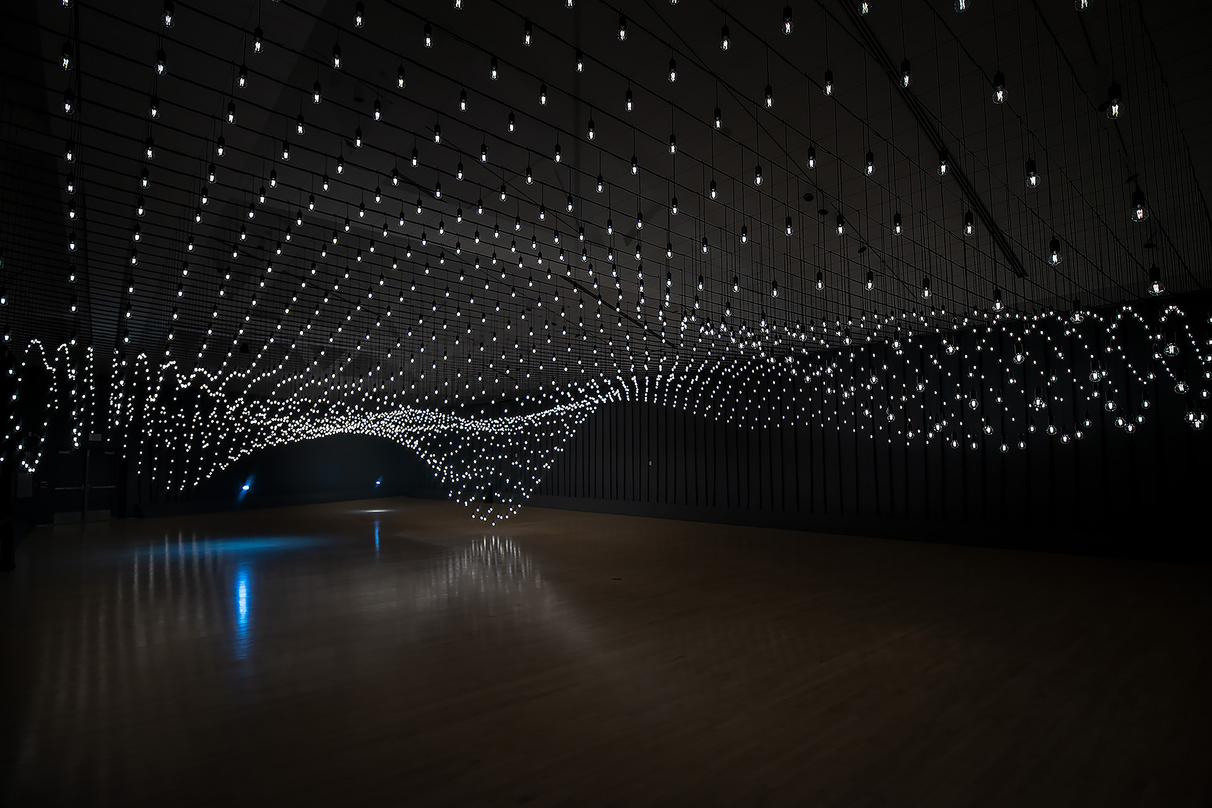 Pulse Topology was an immersive light and sound environment by Mexican-Canadian artist Rafael Lozano-Hemmer (born 1967), an internationally recognized media artist working at the intersection of architecture, technology, and performance. In his work, Lozano-Hemmer creates platforms for public participation and explores themes of agency, human connection, and civic engagement. This site-specific project features an upside-down canopy of mountains and valleys made from thousands of suspended light bulbs that mirror the pulse of visitor participants. The immersive environment highlights the basic but essential biological element—the heartbeat—shared amongst us all. Presented for the first time at Kemper Museum, Pulse Topology is the latest work in Lozano-Hemmer’s Pulse series, comprised of projects that use heart-rate sensors to create interactive audiovisual experiences from participants’ biometric data.