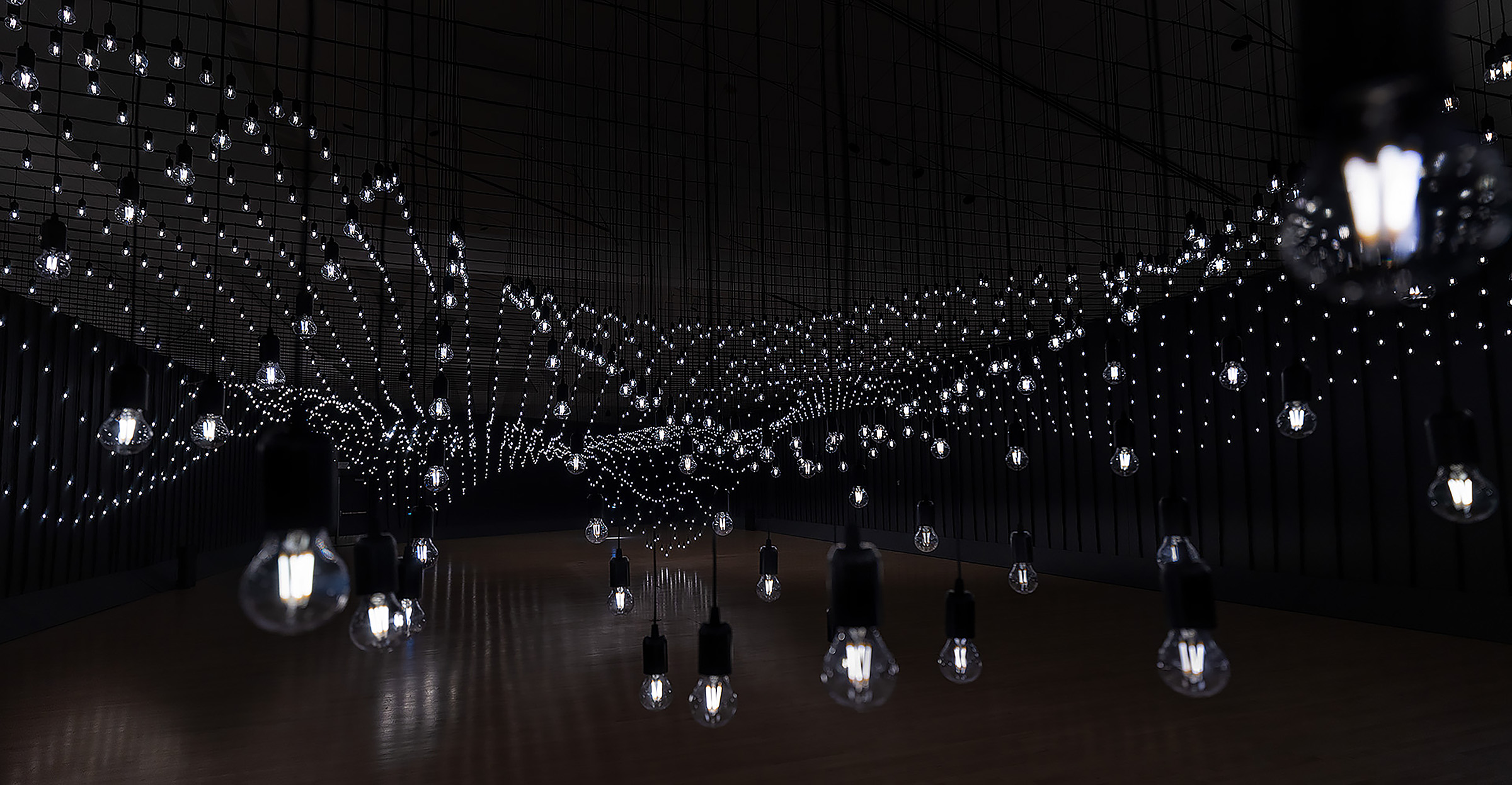 In place of incandescent bulbs which have been used in Lozano-Hemmer’s previous works, Pulse Topology is powered by LED filament light bulbs. Decreasing the energy required to power the installation has allowed Lozano-Hemmer to significantly increase the scale of the project: while previous installations have included 100–300 lightbulbs, Pulse Topology uses 3,000.